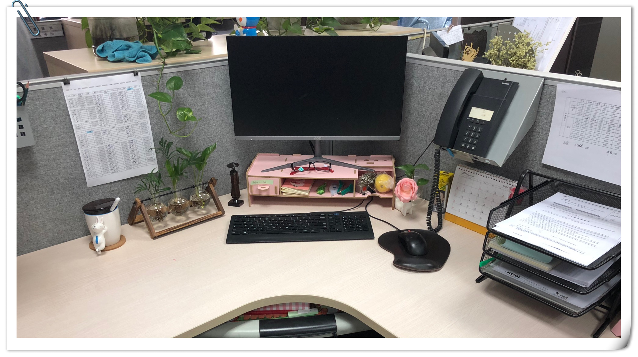 l 化学部刘依云的工位。作为一个准妈妈,依云的工位充满着童趣,更是被绿萝环绕,连桌面的壁纸都很应景,和整个绿萝连成一片,整体效果棒棒哒!