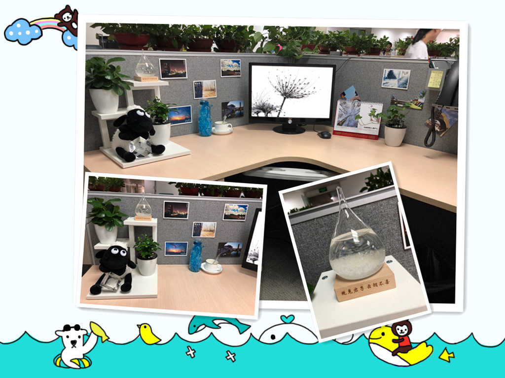 l 电学部王玉婷的工位。可爱的装饰台上点缀了一个气象预报瓶,随着气温的变化,里面的液体也将发生变化,真是足不出户,即可掌握天气情况。